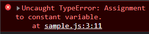 上の画像の通り、エラーを吐いてしまいます。エラー内容としては、「コードの3行目にタイプエラーがあるよ。定数に値は代入できないよ!」と言われています。