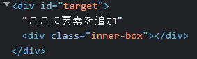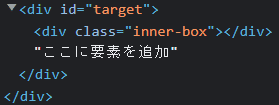 この場合、#targetの中身には「ここに要素を追加」が入っていますが、afterbeginはそれらの要素の先頭にHTML要素を挿入するため、「ここに要素を追加」という文字列の上に.inner-boxが追加されます。