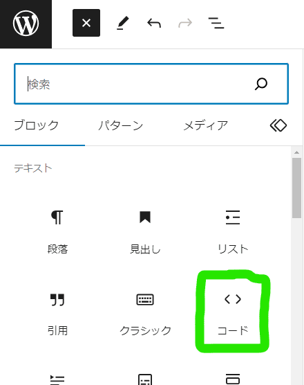 投稿の編集画面はWordPressのバージョンや使用しているテンプレートによって若干異なるものの、基本的には左上にある[ + ]のボタンから現れるブロック一覧に、お目当てのコードブロックがあります。